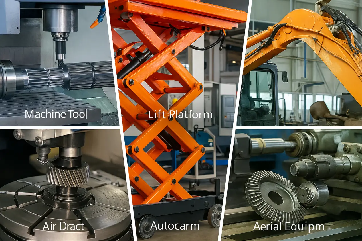 Wspólne zastosowania przemysłowe obejmują również: małe narzędzia maszynowe, sprzęt do pakowania, platformy do podnoszenia, maszyny do miksowania, pojazdy rolnicze i sprzęt budowlany. W tym urządzeniu nie cała moc może być wyprowadzona w linii prostej, a sprzęt stożkowy odgrywa rolę „skręcania narożnika i kontynuowania transmisji”.