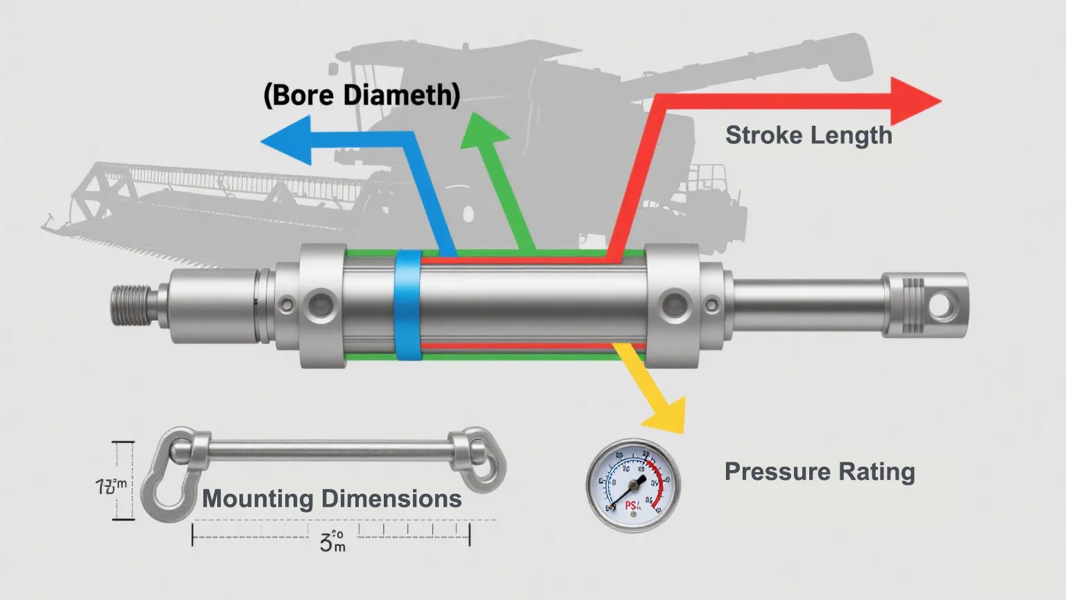 Po pierwsze, średnica otworu. To określa, ile mięśni ma twój cylinder hydrauliczny hydrauliczny. Za małe i będzie miał trudności z podniesieniem tego ciężkiego nagłówka, gdy będziesz w gęstej uprawie. Za duże, a marnujesz siłę, która mogłaby pójść gdzie indziej. Sprawdź specyfikacje swojego starego cylindra lub instrukcję instrukcji kombajnowej - ta liczba musi się dopasować, prosty i prosty, jeśli chcesz, jaką siłę zajmuje trudne dni w terenie.