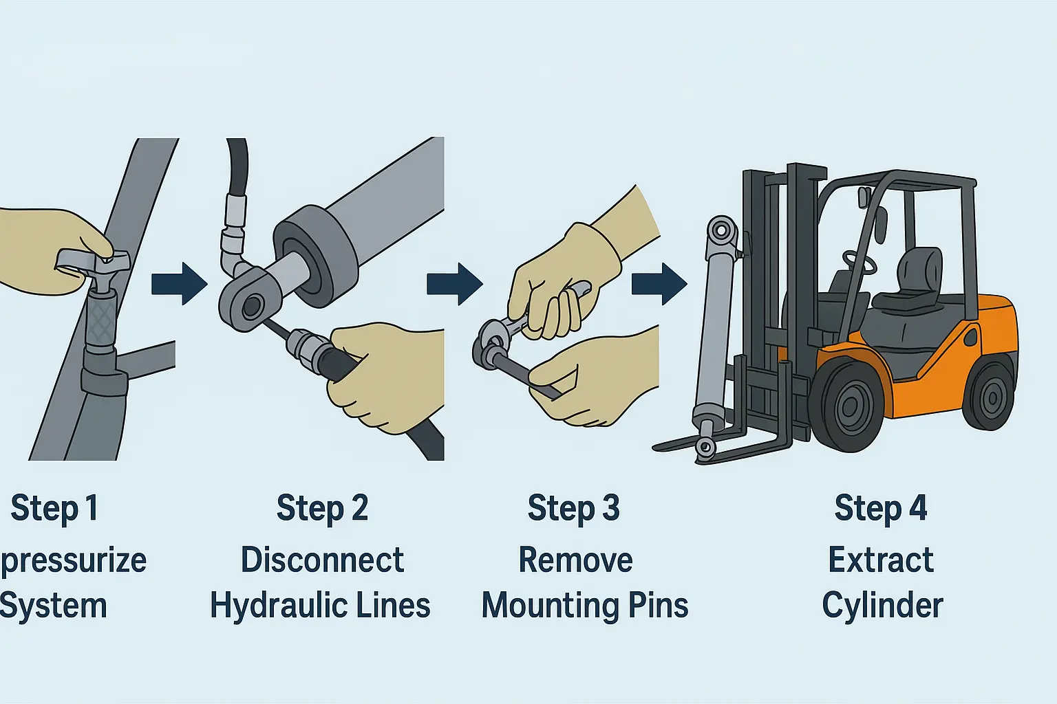 Czwartym krokiem jest ostrożne usunięcie cylindra hydraulicznego. Całe ciało cylindra jest ciężkie. Zaleca się, aby dwie osoby działały lub korzystały z zawiesi. Uważaj, aby nie trafić w otaczającą konstrukcję i nie utrzymywać cylindrowego usta skierowanego do góry, aby zapobiec przepełnieniu wewnętrznego resztkowego oleju.
