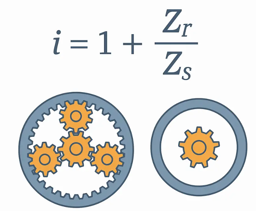 Dla prostego przykładu: jeśli liczba zębów na biegu słonecznym wynosi 20, a liczba zębów na pierścieniu wewnętrznym wynosi 60, wówczas współczynnik transmisji wynosi: