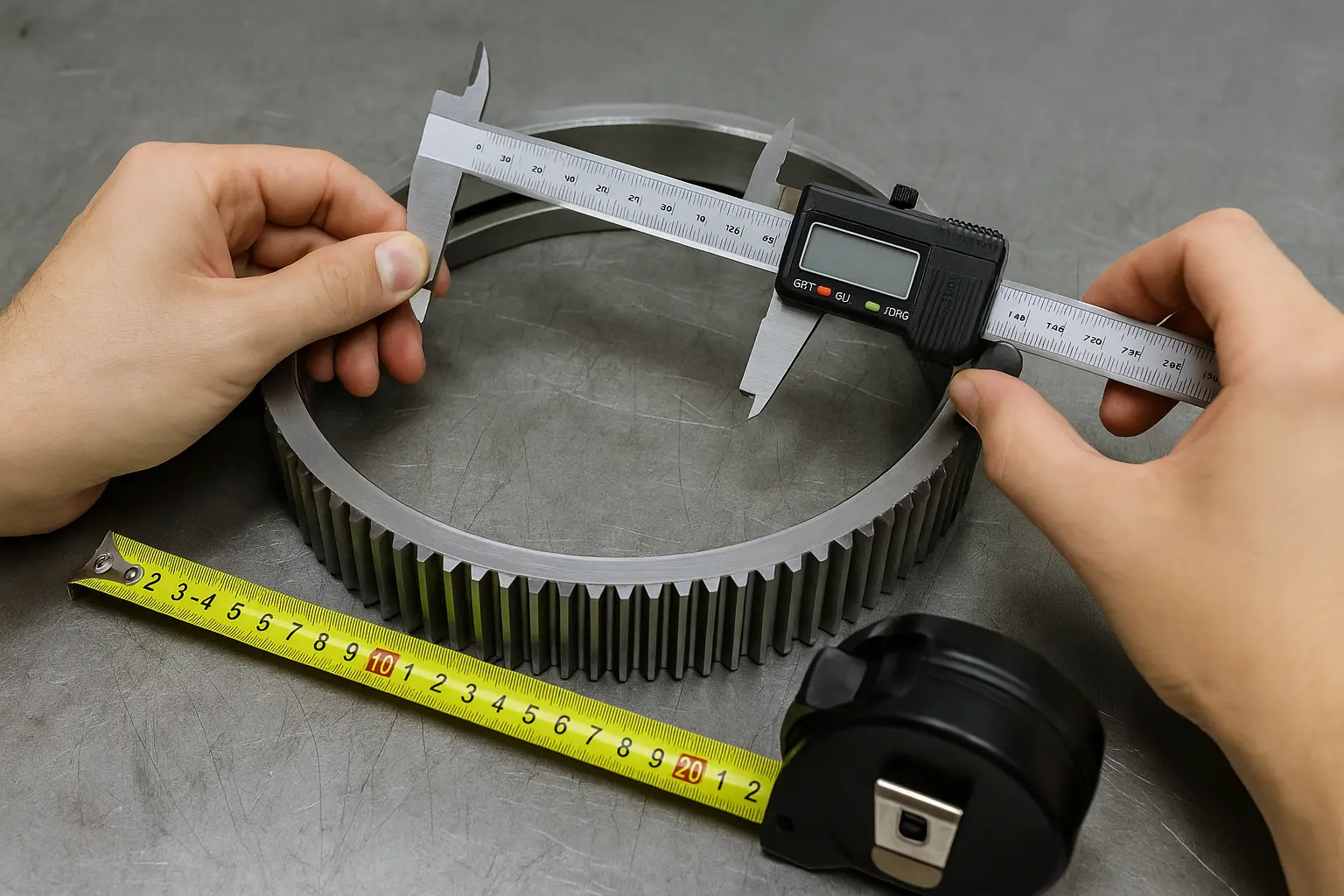 Użyj zacisku, aby zmierzyć odległość od najbardziej zewnętrznej krawędzi pierścienia przekładni do najbardziej zewnętrznej krawędzi, która jest tak zwaną „zewnętrzną średnicą”. Ta wartość określa przestrzeń zajmowaną przez pierścień przekładni w ogólnej strukturze. Nie może być zbyt duży ani zbyt mały i musi pasować do pozycji oryginalnego sprzętu.